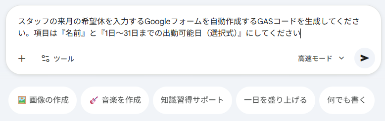 Geminiのチャット画面を開き、「スタッフの来月の希望休を入力するGoogleフォームを自動作成するGASコードを生成してください。項目は『名前』と『1日〜31日までの出勤可能日(選択式)』にしてください」 と入力します。
