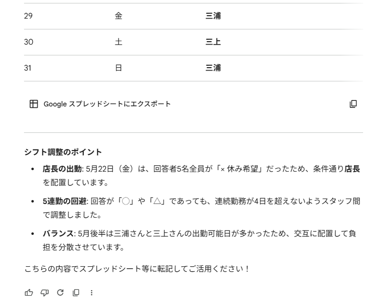 スタッフへの周知をスムーズに Geminiで作成したシフト表は、そのままコピーしてLINEやSlack、Microsoft Teamsなどの連絡ツールに貼り付けることができます。 「スプレッドシートにエクスポート」したものをURLで共有すれば、スタッフはいつでも最新の状況をスマホから確認可能です。