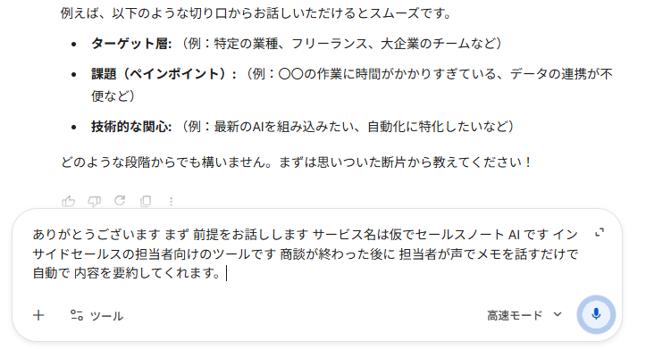 「これから、新しいSaaSサービスの企画書を一緒に考えてほしい」と投げかけます。その後、Geminiから返ってくるターゲット層や課題に関する質問へ、再び音声でアイデアを返していく対話形式を繰り返しました。