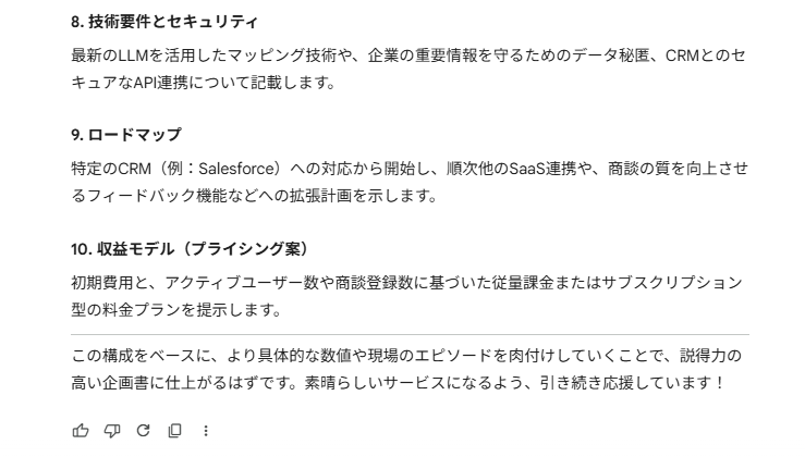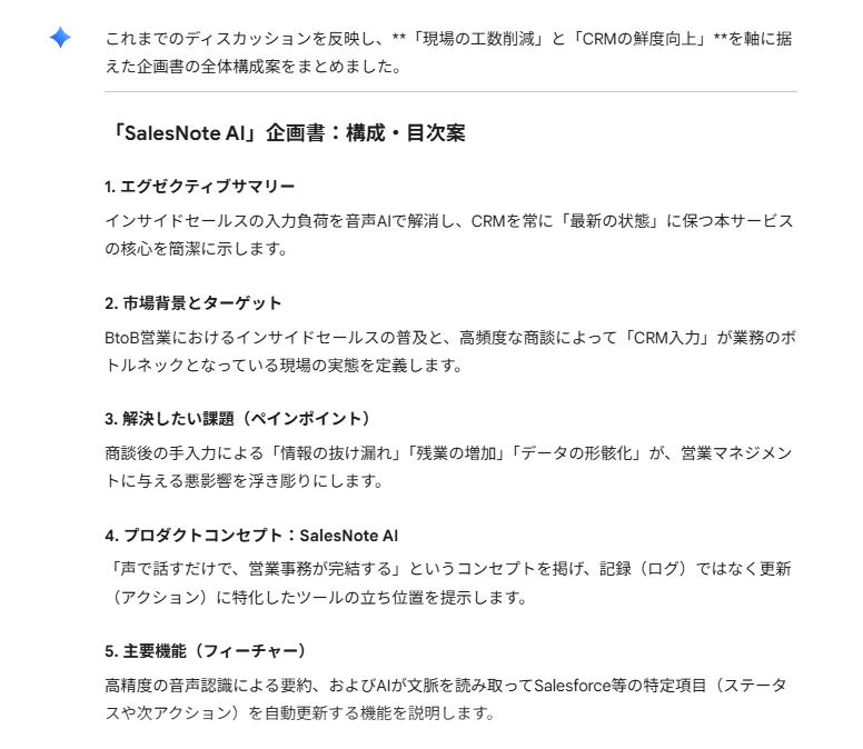 数分間の音声対話の後、「これまでの会話を元に、企画書の目次と各項目の概要をまとめて」と指示したところ、論理的に構成された極めて完成度の高い企画書ドラフトが出力されました。