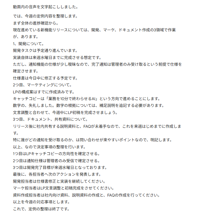 - 手作業で動画を視聴し内容をまとめる時間を削減できるため、本来注力すべきコア業務に集中できます