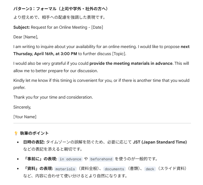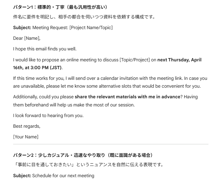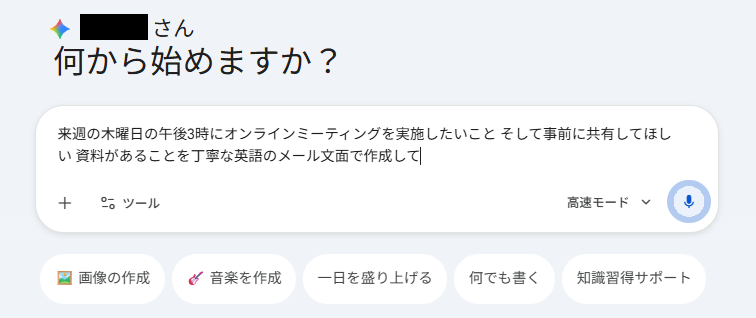 マイクをオンにし、日本語で「来週の木曜日の午後3時にオンラインミーティングを実施したいこと、事前に共有してほしい資料があることを、丁寧な英語のメール文面で作成して」と口頭で指示を出しました