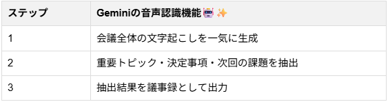 Geminiの音声認識機能は、単なる文字起こしの枠を超え、ビジネスシーンを強力にサポートする多彩な機能を備えています。