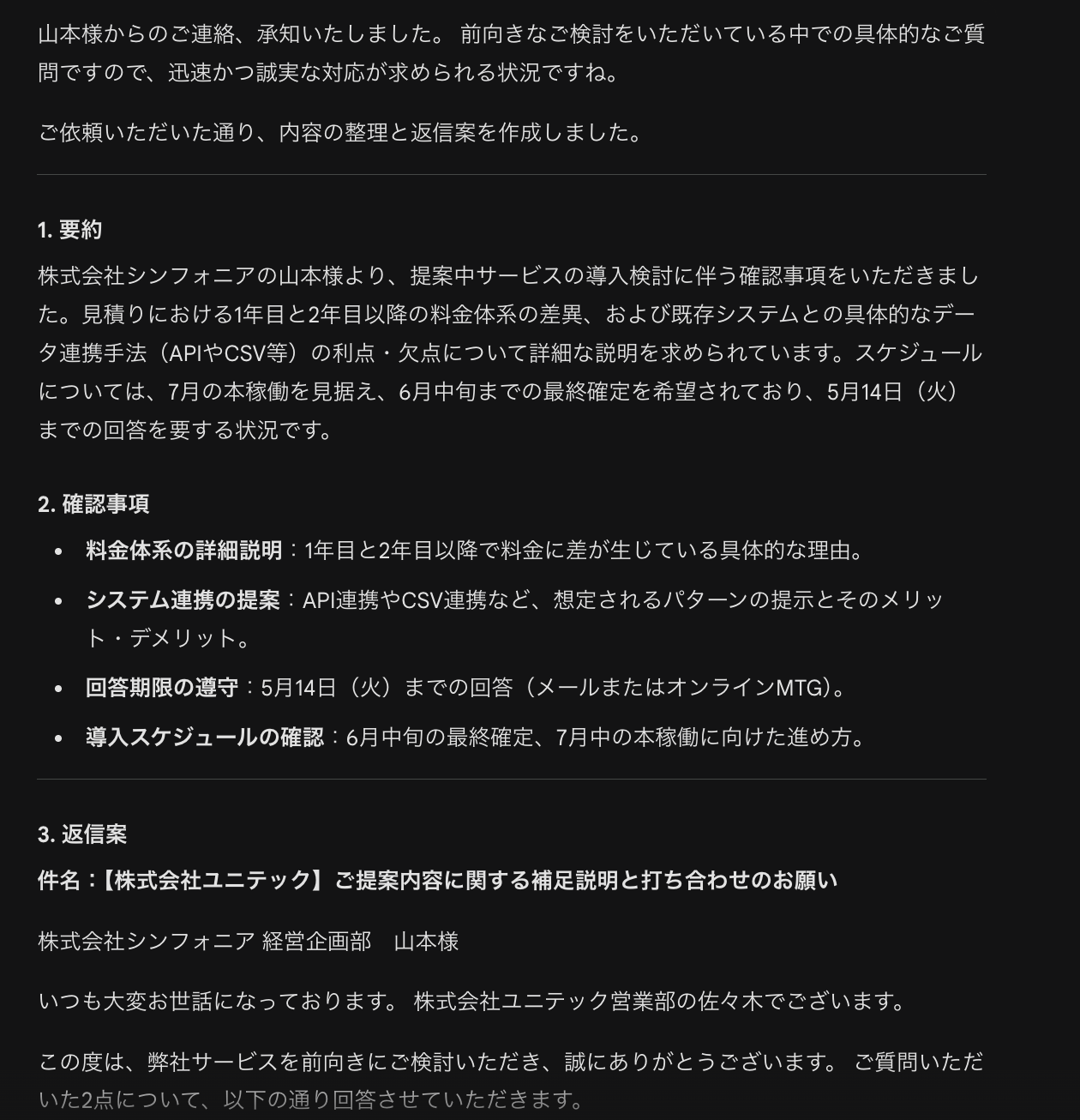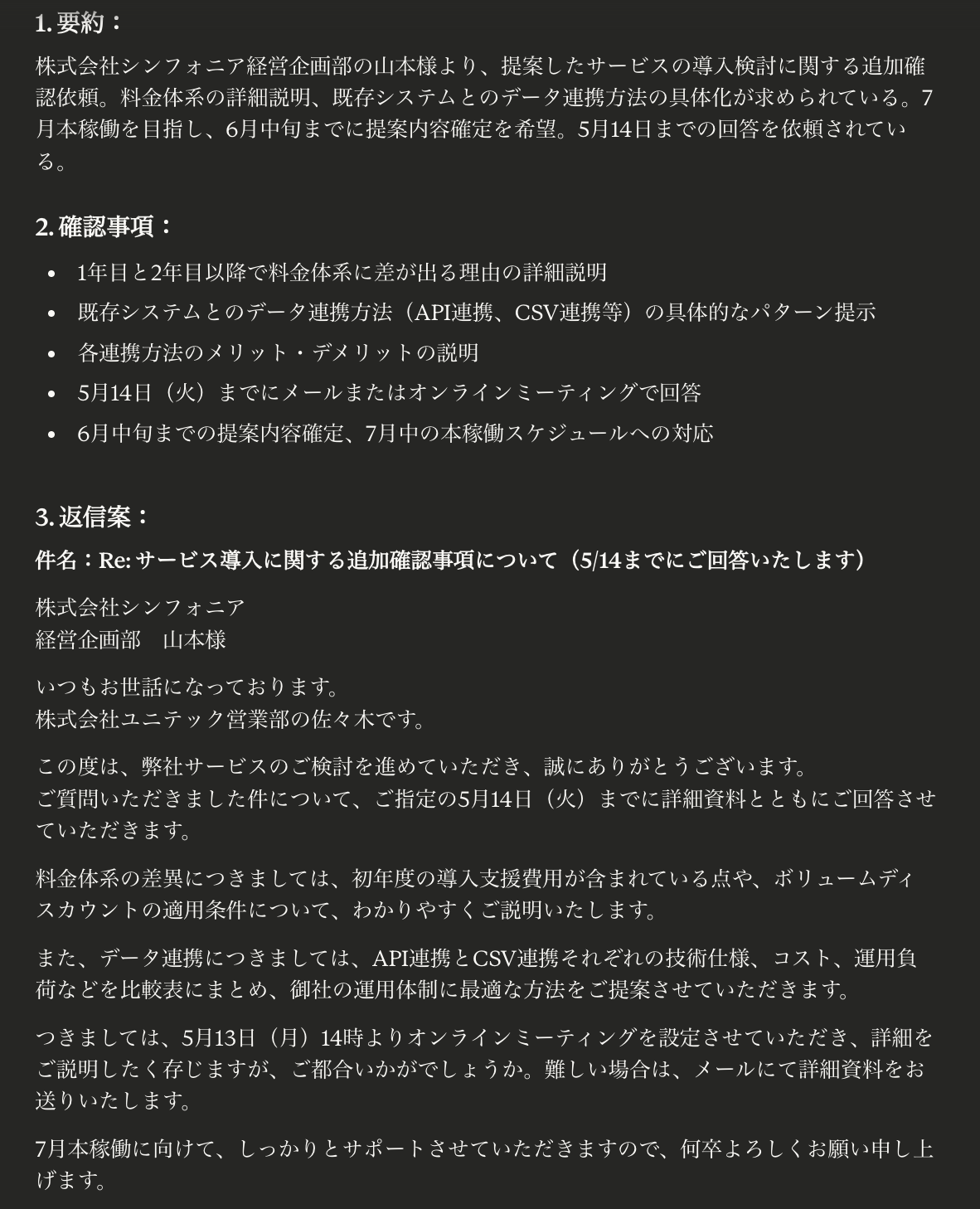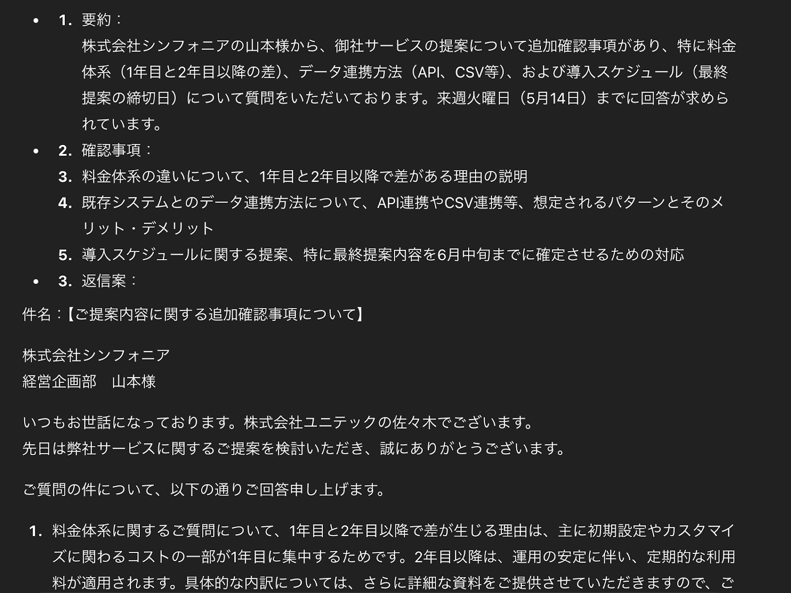 長文メールから重要な要点を適切に抽出して整理することは大変な作業ですが、果たしてAIの対応力はどの程度なのか…結果が楽しみです!