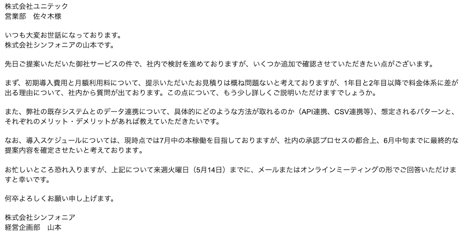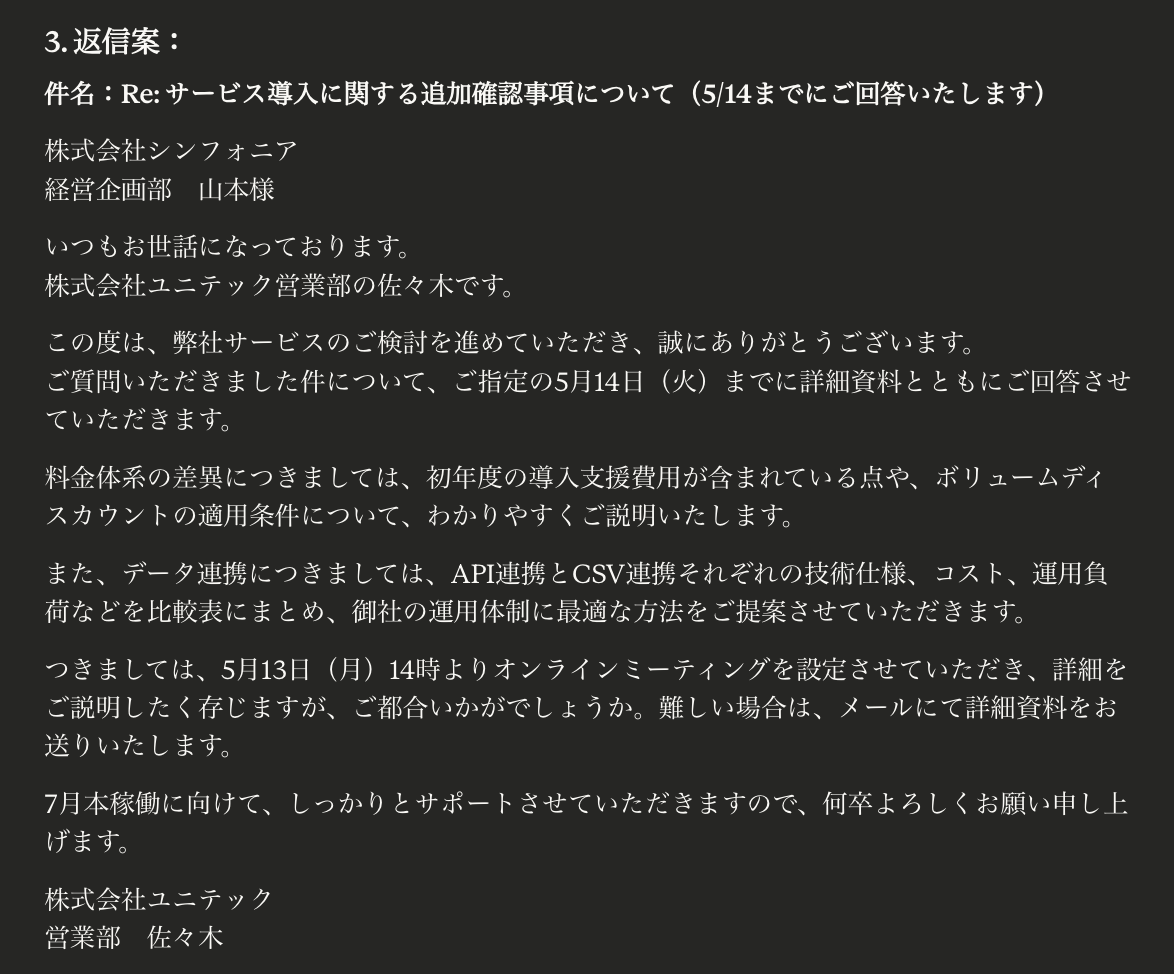 3. 営業担当者としての返信メール案(件名・本文、400〜600文字程度)
