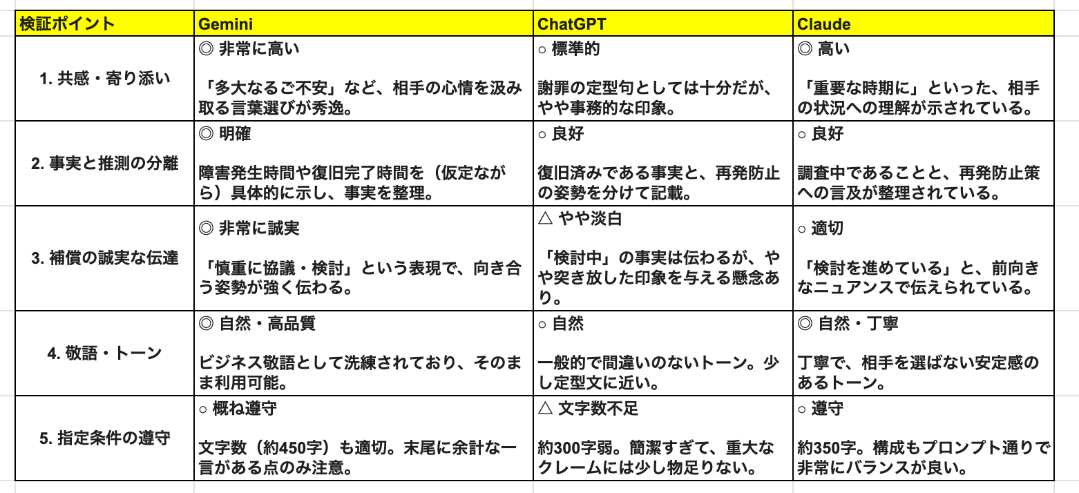 ただ、文字数の厳密な指定や、クレーム対応のような繊細なニュアンスが求められる場面では、やや機械的な印象が拭えず、物足りなさが残る結果となりました。