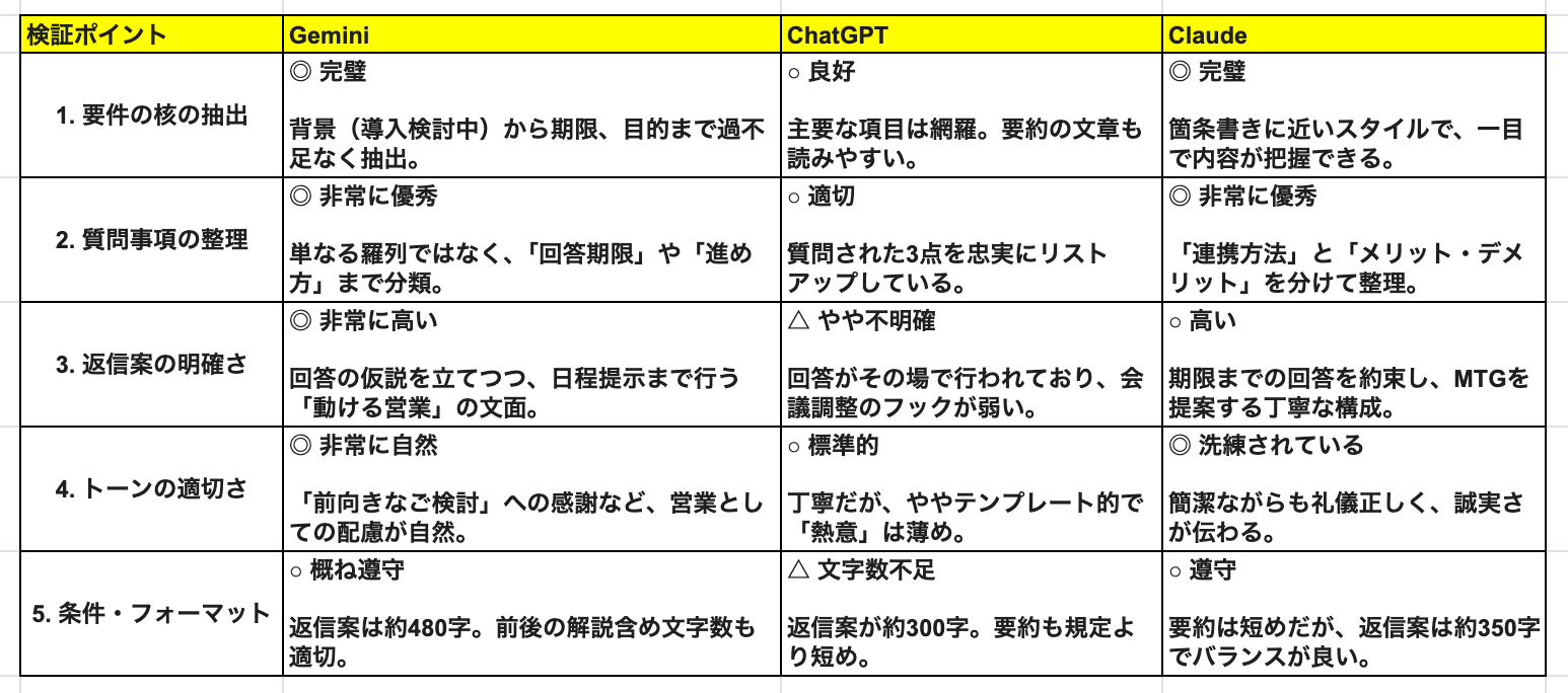 今回の検証から、「相手の懐に入る提案力ならGemini、スピード重視の定型業務ならChatGPT、情報の整理力ならClaude」という明確な役割分担が見えてきました。