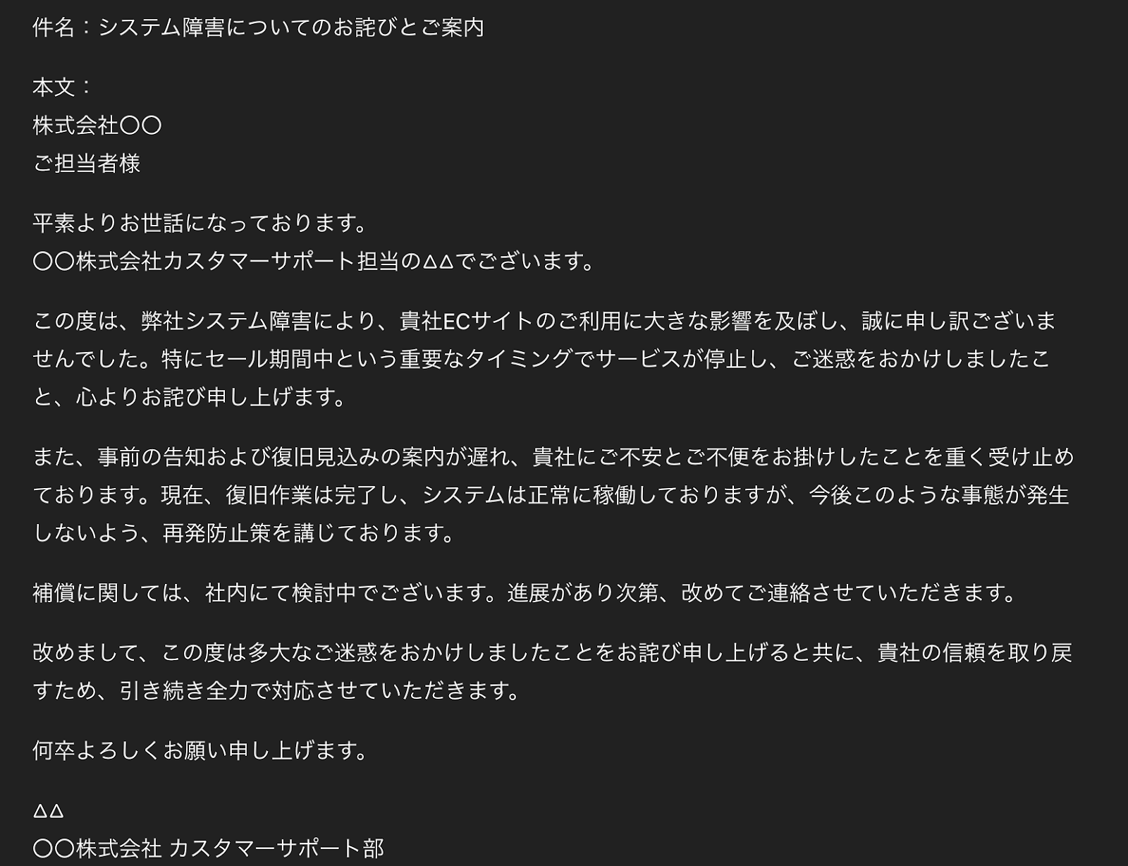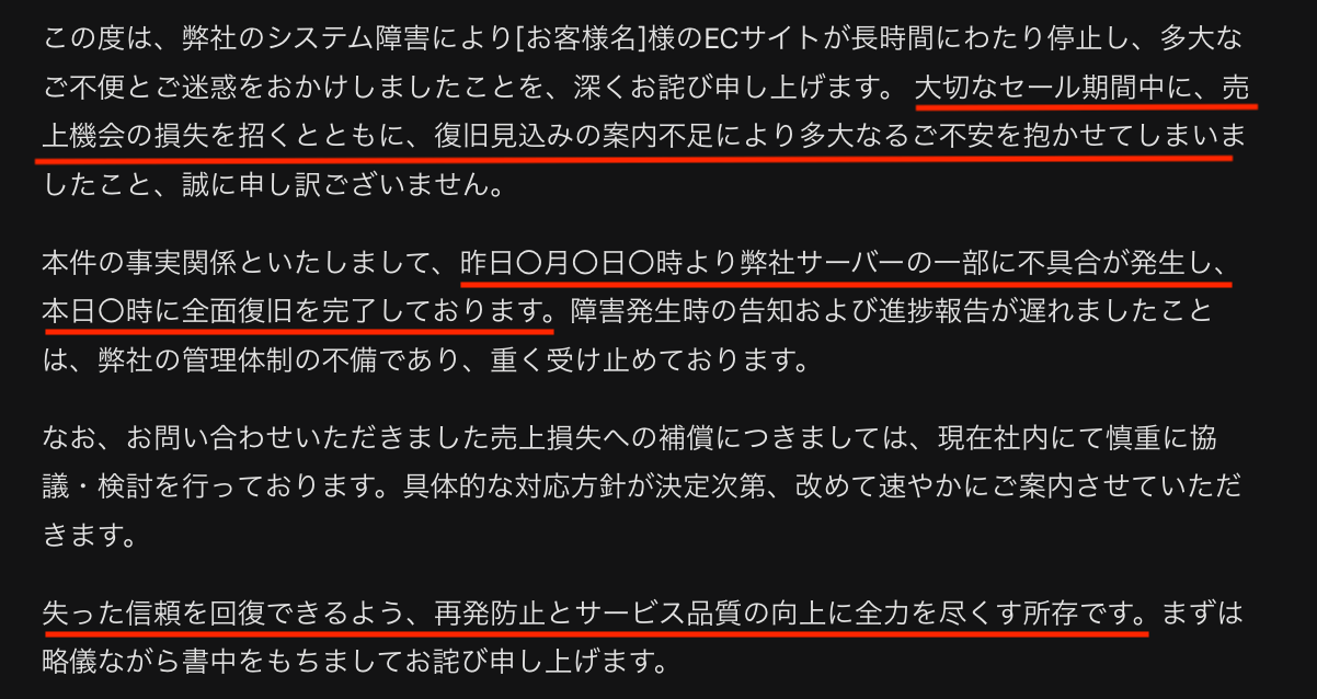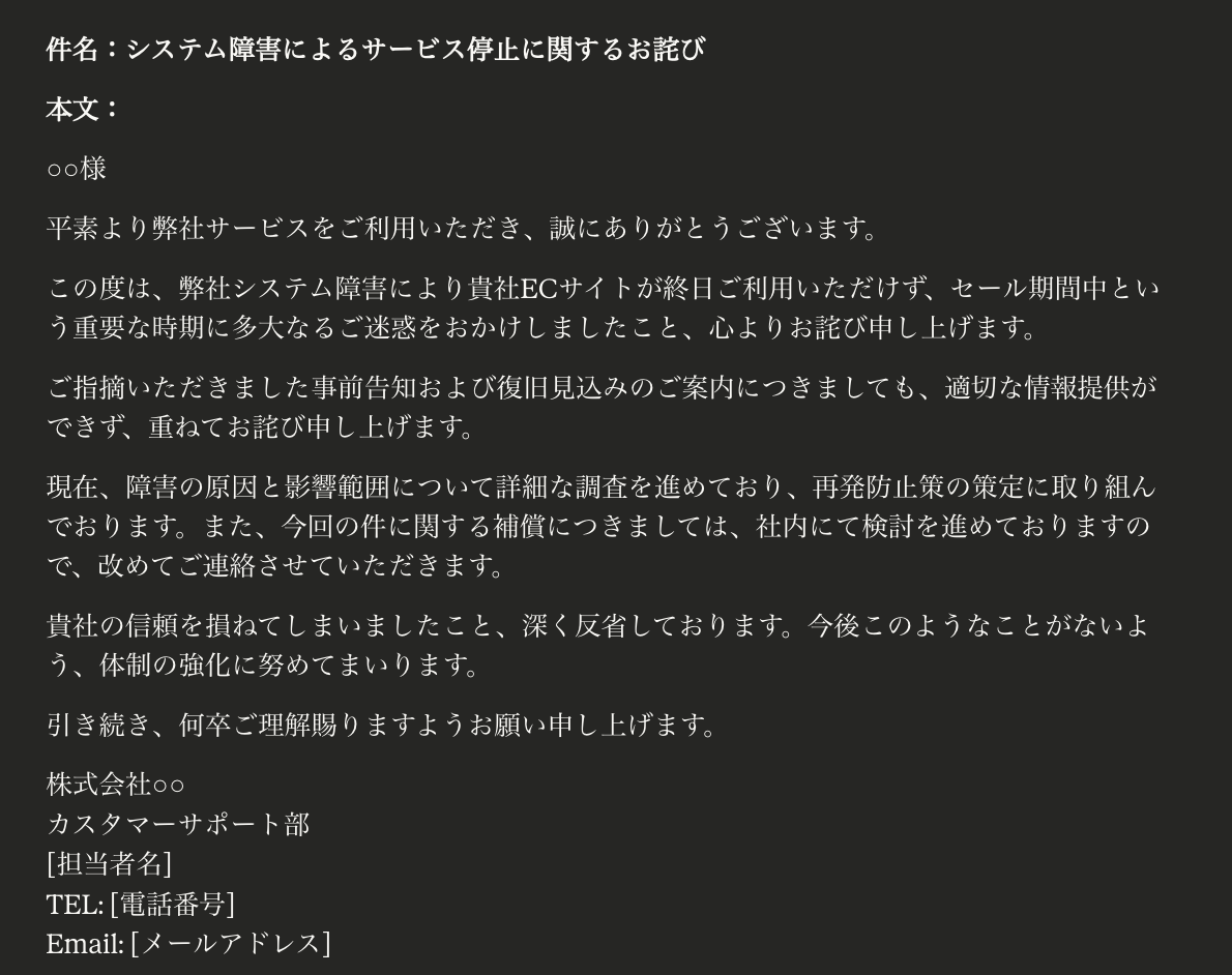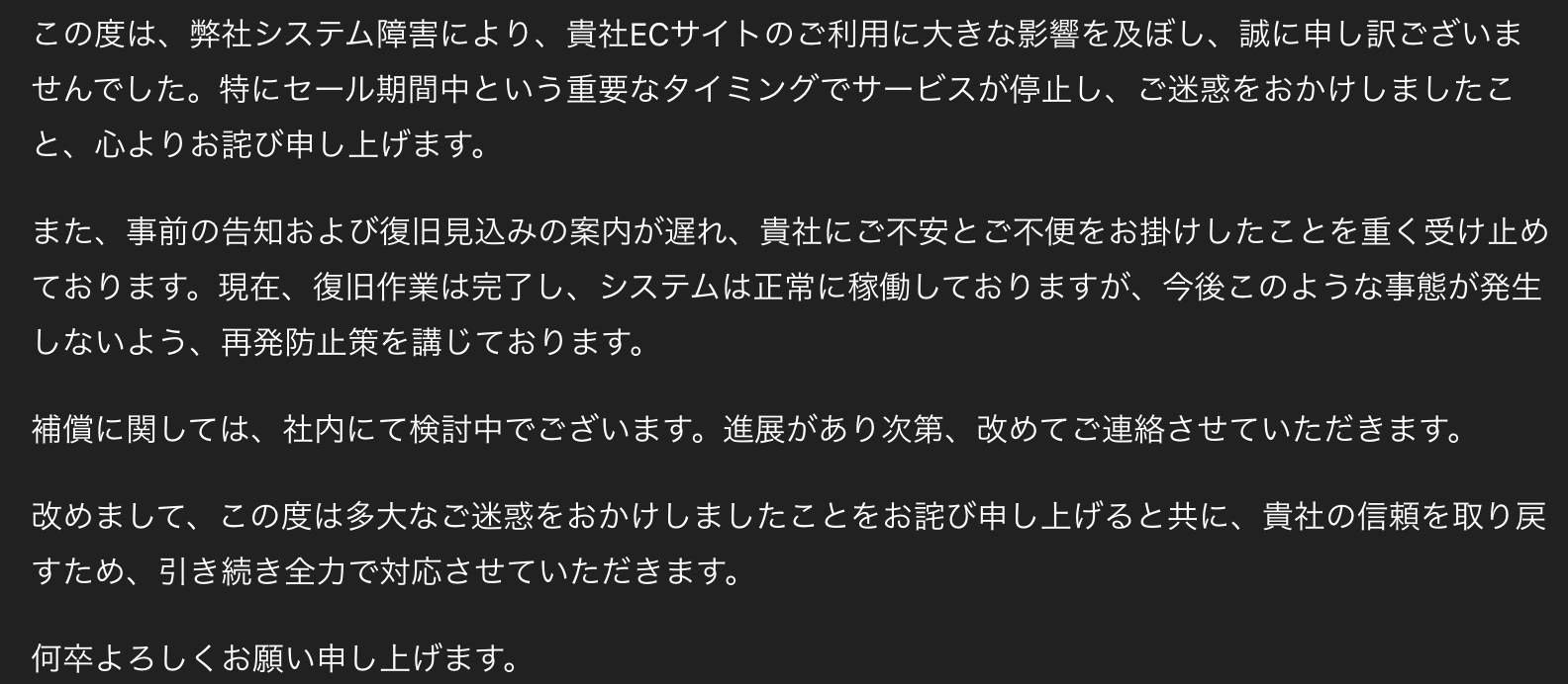「御社のシステム障害のせいで、うちのECサイトが丸一日使えませんでした。