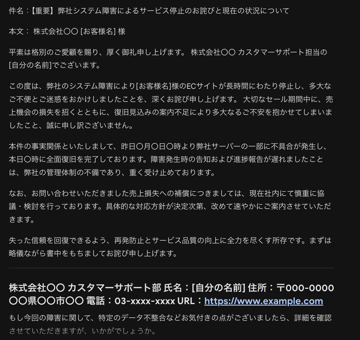 - 補償については社内検討中であるため、「検討中」であることを誠実に伝える