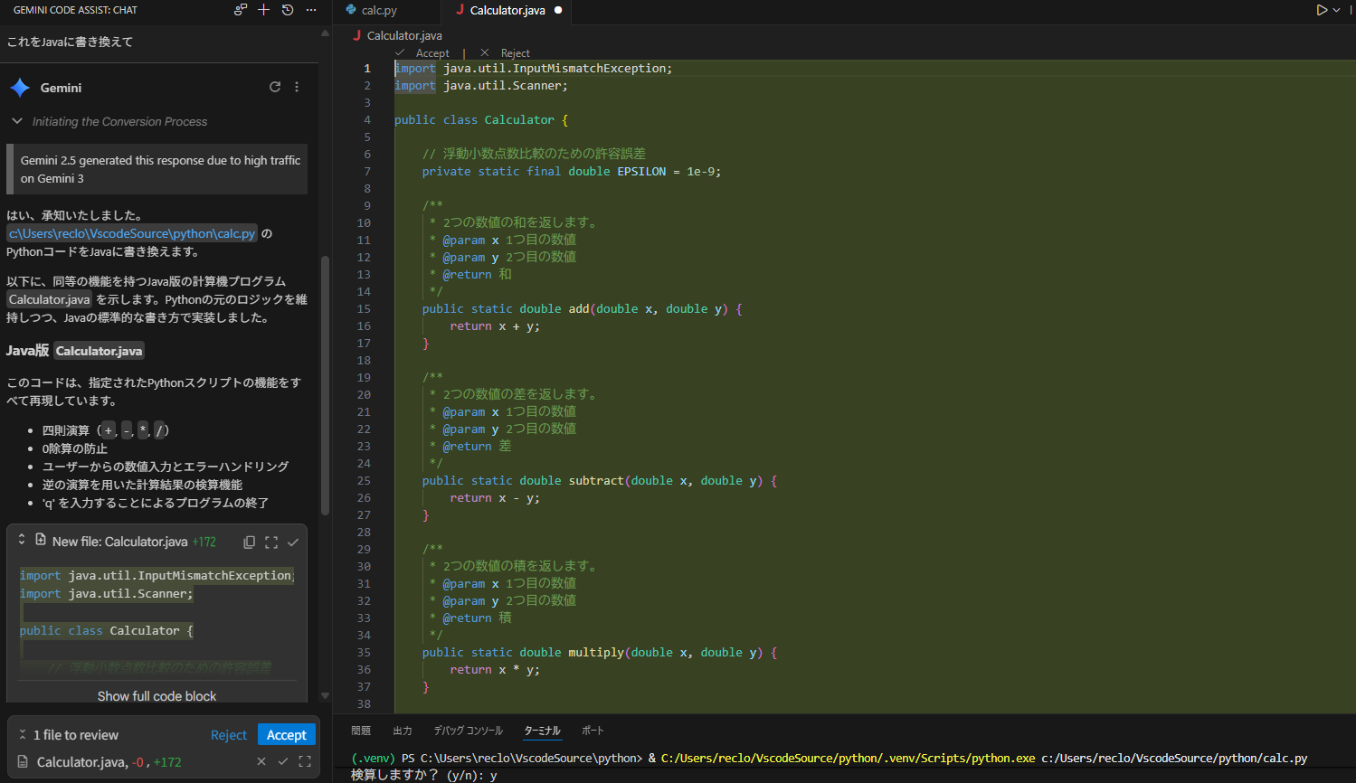 次にPythonで書いた簡単な計算のプログラムを提示し、「これをJavaに書き換えて」と指示しました。