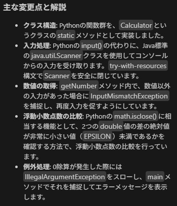チャット欄には変換時のポイントなども記載されており、初めて使用する言語の場合でも理解しながらコーディングを進めることができます。