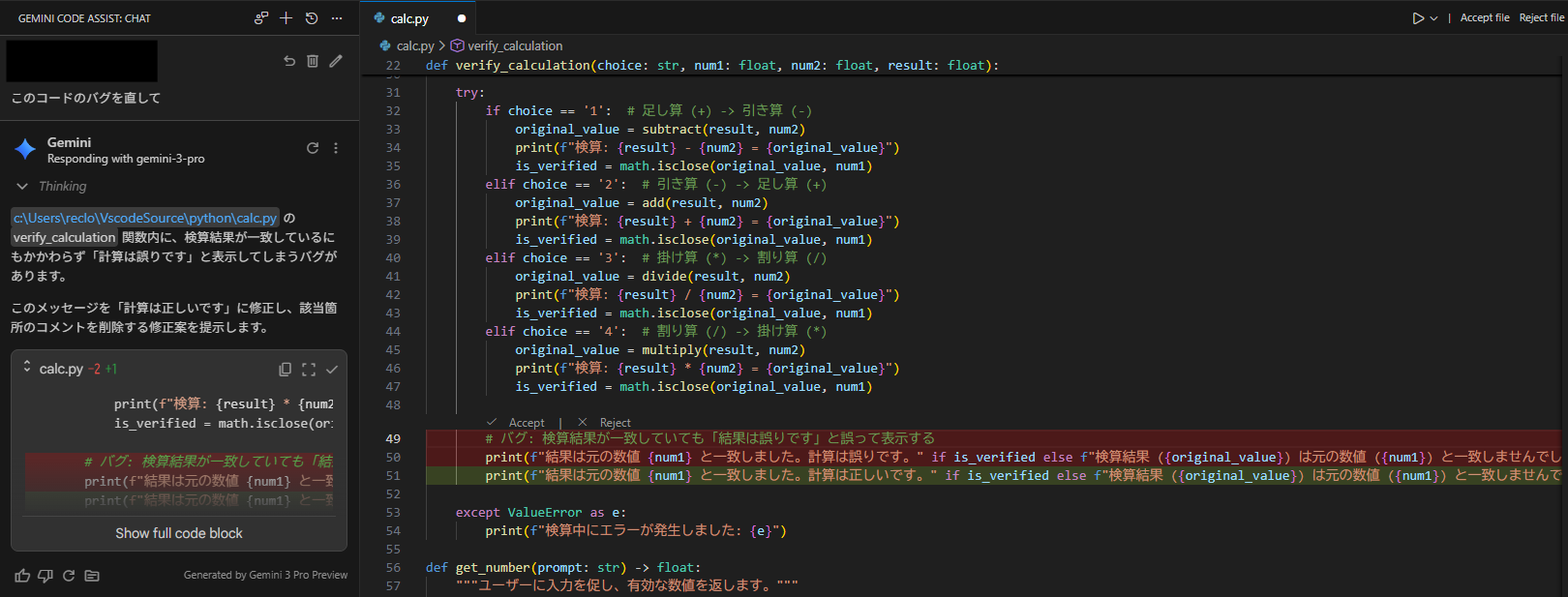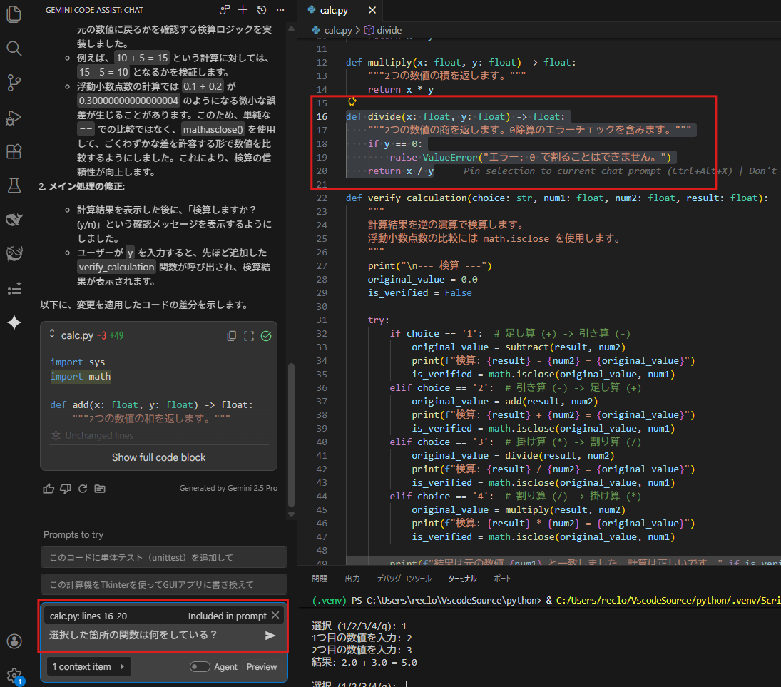 意図的に単純なバグを含ませたPythonコードを提示し、「このコードのバグを直して」と指示しました。