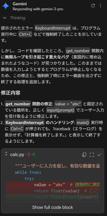 結果、数秒で問題箇所を特定し、修正されたコードを提示してくれました。