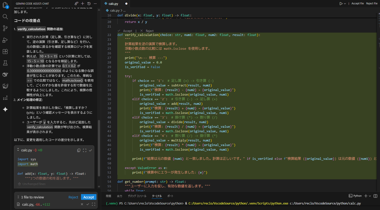 チャット欄では日本語ベースでの解説を行ってくれていて、ソースも勝手に修正するわけではなく、修正前後の行が並んで表示されるため、確認がしやすいところも便利な点です。