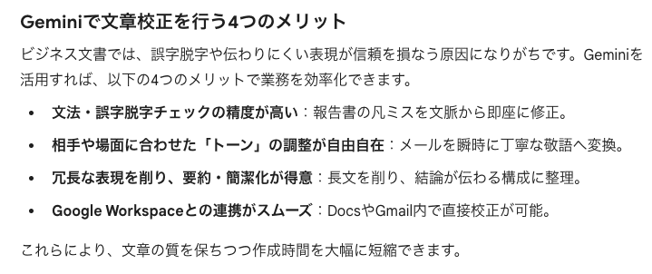 - 見出しタイトル: 「Geminiで文章校正を行う4つのメリット」