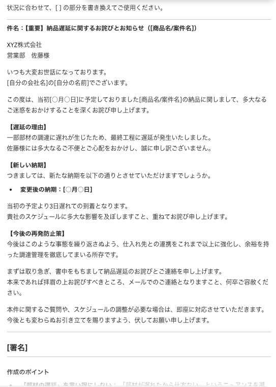 部材の調達遅延により、当初○月○日に予定していた納品が3日遅れることになってしまいました。