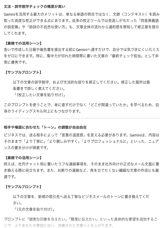 - 構成: 1. 導入:ビジネス文章でよくある課題(誤字脱字、伝わりにくい表現など)に軽く触れる 2. Geminiで文章校正を行う4つのメリットを箇条書きで整理(「文法・誤字脱字チェックの精度が高い」「相手や場面に合わせた「トーン」の調整が自由自在」「冗長な表現を削り、要約・簡潔化が得意」「Google Workspace(Docs、Gmailなど)との連携がスムーズ」) 3. 各メリットについて、ビジネスシーンの具体例を交えて解説