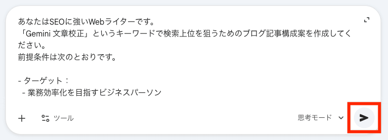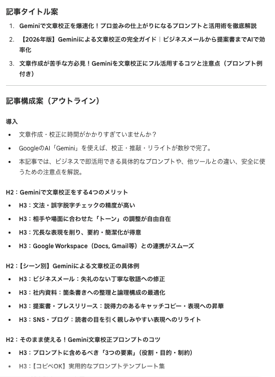 まずは、「Gemini 文章校正」というキーワードで構成案を作成します。