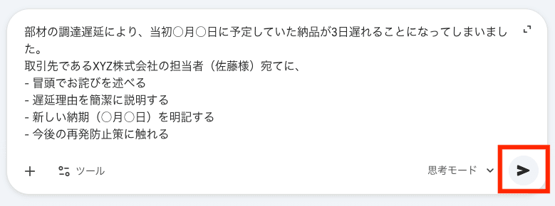 続いて、取引先への謝罪メールの文章をGeminiに作成してもらいます。