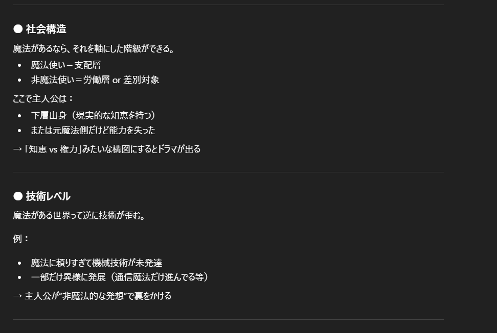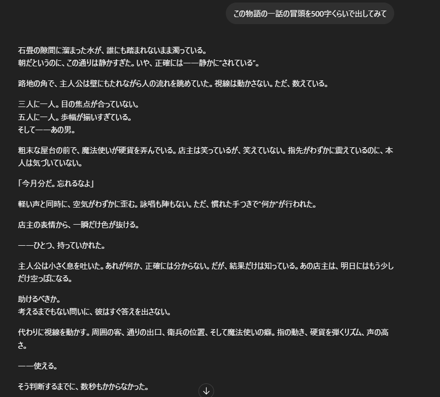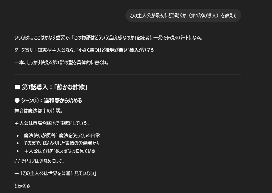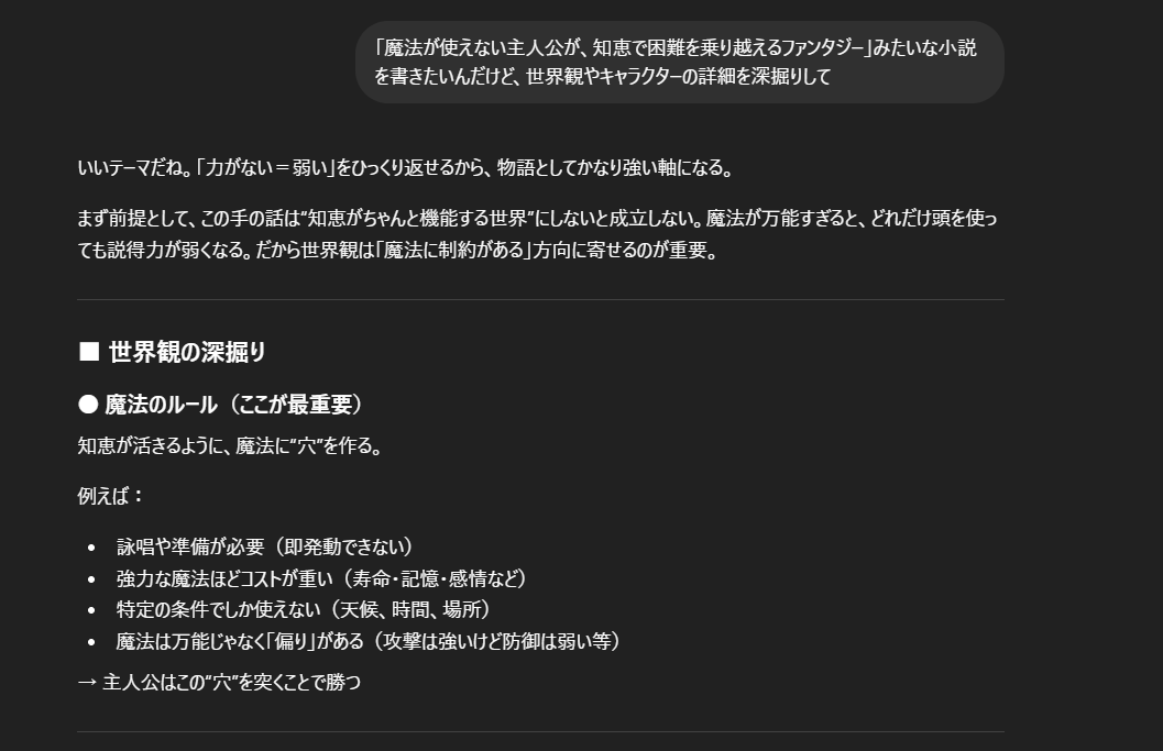 たとえば「魔法が使えない主人公が、知恵で困難を乗り越えるファンタジー」といった大まかなテーマを伝え、世界観やキャラクターの詳細を深掘りしてもらいます。AIから複数の提案を受け取り、人間が面白いと感じた要素をピックアップして骨組みを完成させます。