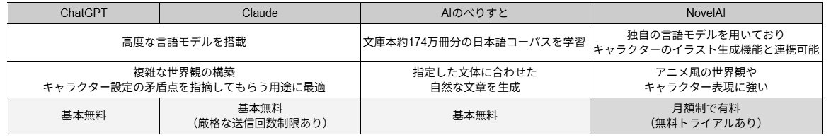 ☝️おすすめのAI小説生成ツール比較(モデル・価格・特徴)