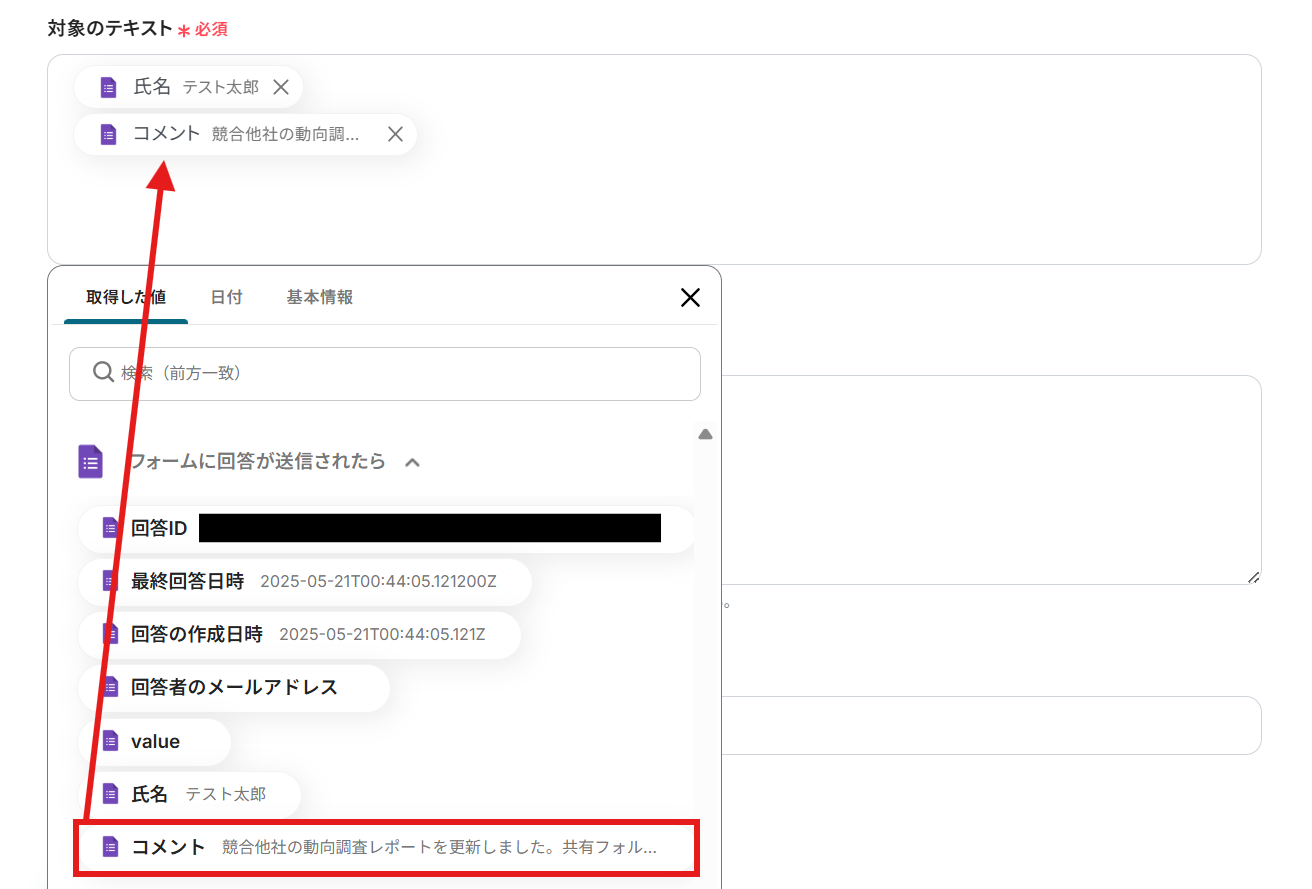 対象のテキスト:編集欄をクリックするとGoogleフォームから取得した情報を引用できます。