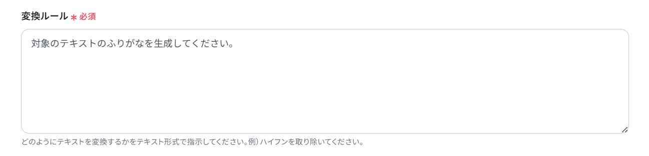 カタカナにしたい場合は、変換ルールで設定している「対象テキストのふりがなを生成してください」の箇所を「対象のテキストのふりがなをカタカナで生成してください」といったように設定してください。