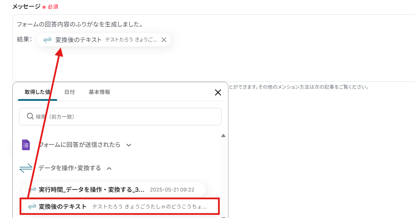 - Googleフォームのトリガー設定とデータ変換(ふりがな生成)、Slackのアクション設定