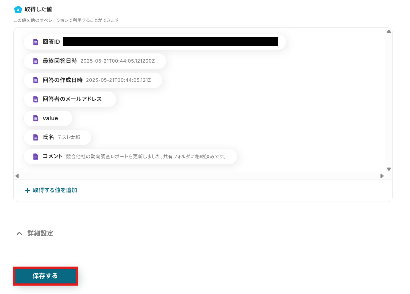 テストが成功すると「テスト成功」の画面が表示され、Googleフォームから取得した情報を引用できるようになります。