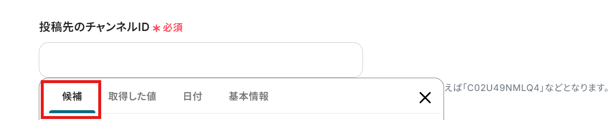 投稿先のチャンネルID:入力欄をクリックすると候補が表示されるので、その中から選択しましょう。