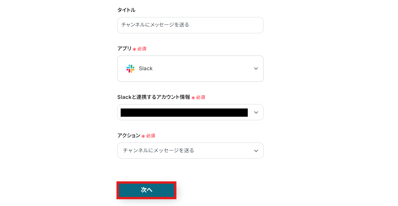 Slackと連携するアカウント情報はプルダウンから選択します。