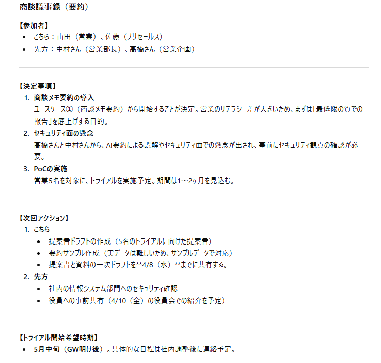 ほんの数秒で要点が完璧にまとまった議事録が出力されました。