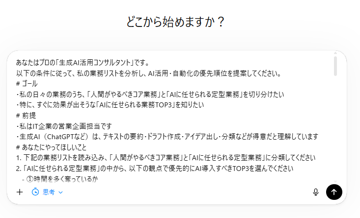 ChatGPTに対して、「あなたはプロのAIコンサルタントです。私の日々の業務リストを分析し、最も費用対効果が高く、AIで自動化すべき業務を提案してください」といったプロンプト(指示文)を入力してみました。