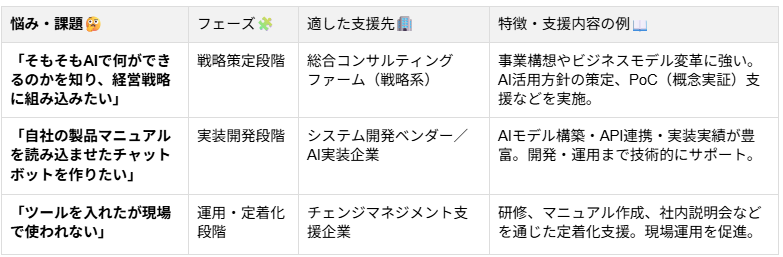 コンサルティング会社を選ぶ際の第一歩は、自社が求めている支援の範囲を明確にすることです。たとえば「どの業務からAIを適用したいのか」「戦略立案から伴走してほしいのか、それとも既存ツールを活用した現場レベルの改善が中心なのか」といった観点を整理しておくと、ミスマッチを防ぎやすくなります。