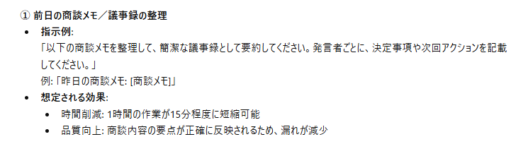 あわせて具体的な活用プロンプトも提示され、瞬時に業務改善のロードマップを得ることができました。
