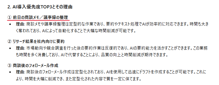数秒後、「前日の商談メモ/議事録の整理をAIに代替することで、品質の向上と時間削減が期待できる」という的確な回答が出力されました。