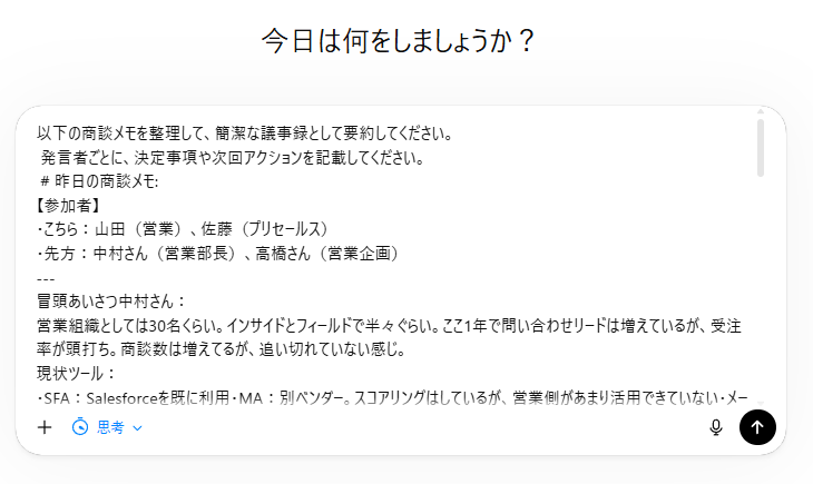 架空の商談メモとステップ②で得られたプロンプトを使用し、検証を行います。