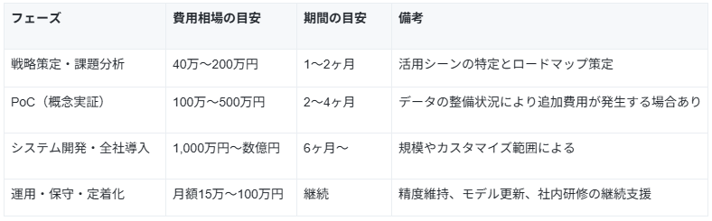 費用は、支援内容の深さや期間、そして依頼するコンサルティング会社のタイプによって大きく変動します。月額数十万円程度の伴走型支援から、戦略策定・開発・研修を一括で依頼する数千万円規模の案件まで、費用は支援範囲により大きく異なります。