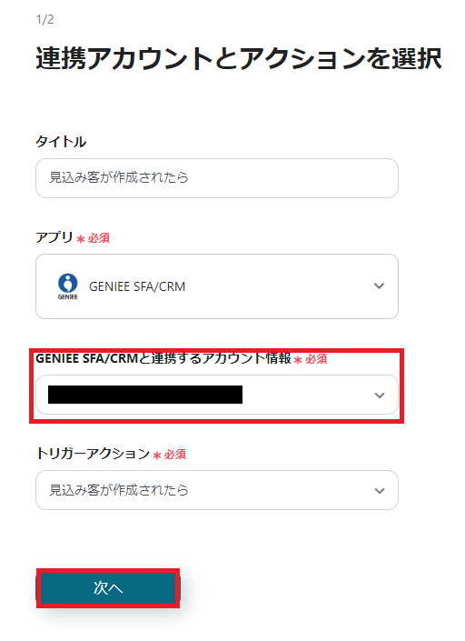 まずは「見込み客が作成されたら」を選択して、設定の確認をしていきます。
