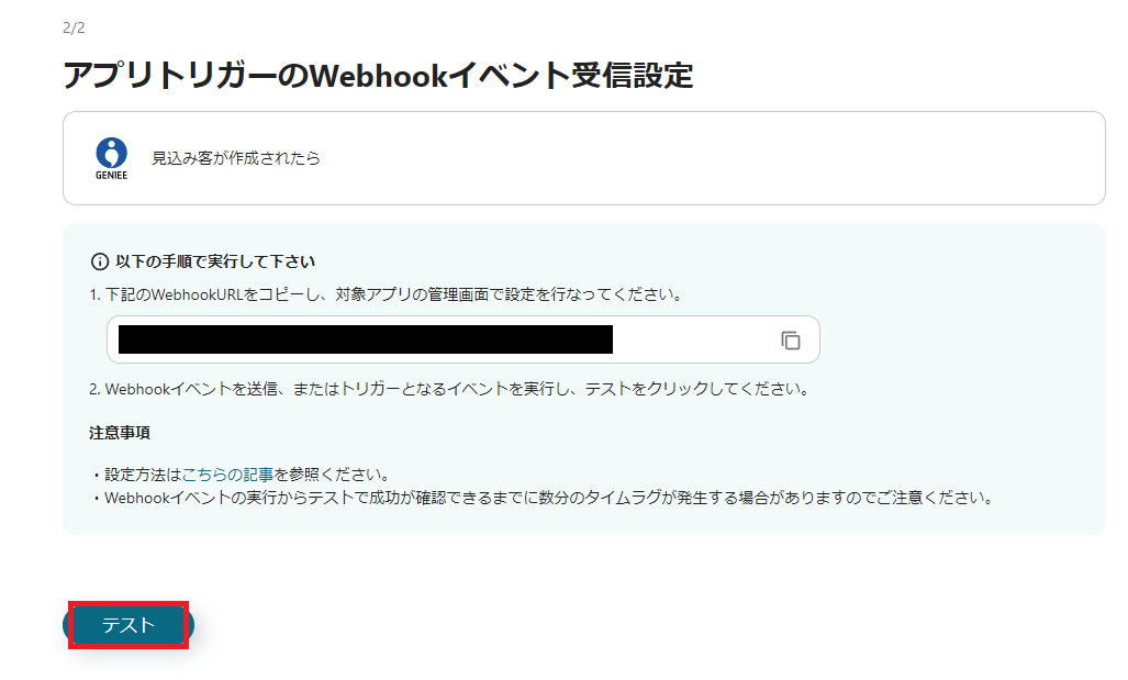 テストボタンを押下することで動作確認が可能です。