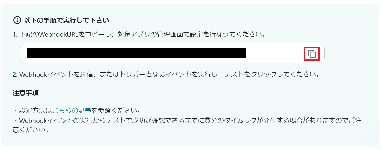 画面が表示されたら、赤枠をクリックし、Webhook URLをコピーしましょう。
