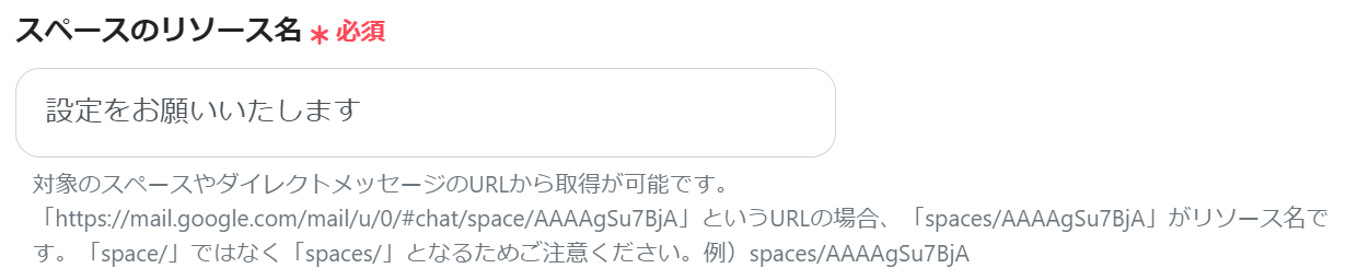以下の画面が表示されるので、「スペースのリソース名」を説明文を読んで設定してください。