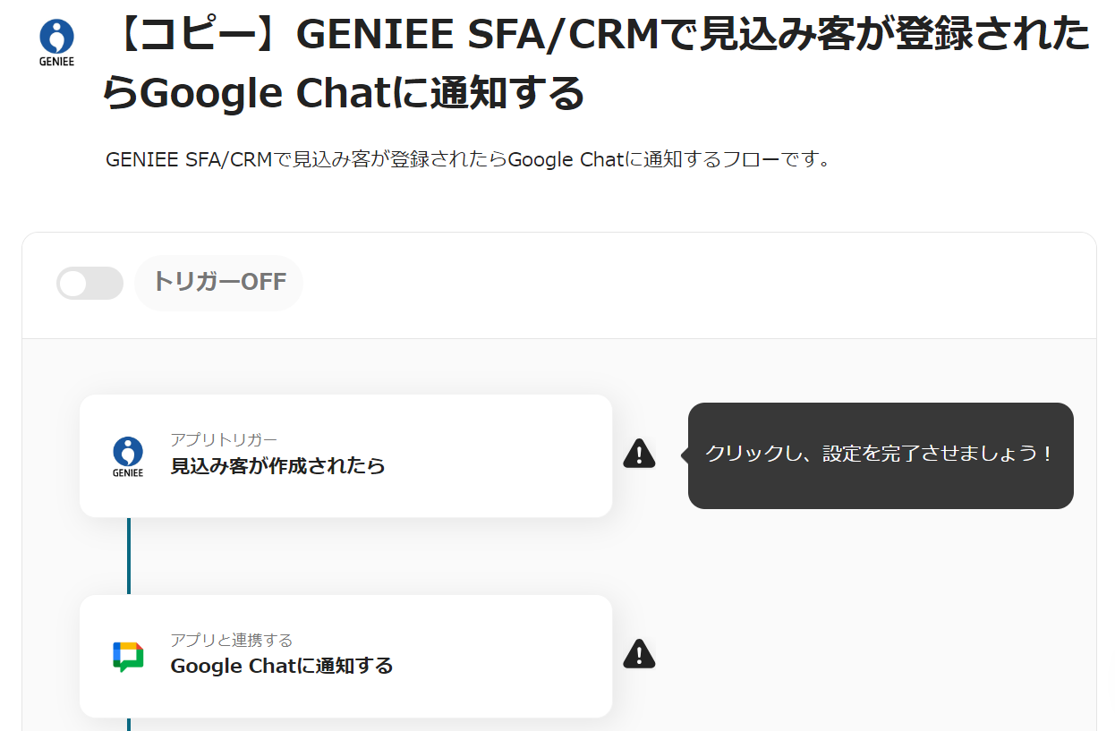 今回は「GENIEE SFA/CRMで見込み客が登録されたらGoogle Chatに通知する」という以下のテンプレートの設定方法をご紹介します。