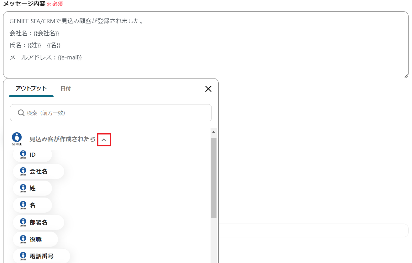 ※赤枠をクリックすることで、GENIEE SFA/CRMのアウトプットを利用できます。