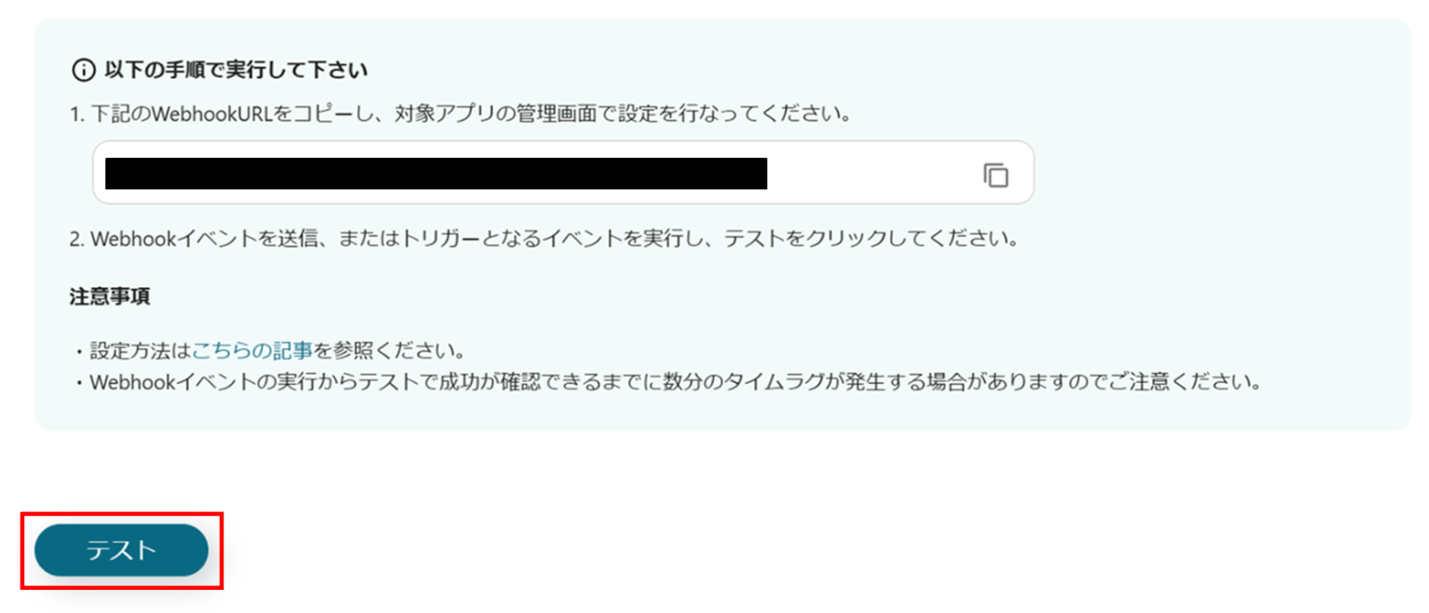 (3)「アプリトリガーのWebhookイベント受信設定」画面から、WebhookURLをコピーし、GENIEE SFA/CRMの管理画面で設定を行なってください。