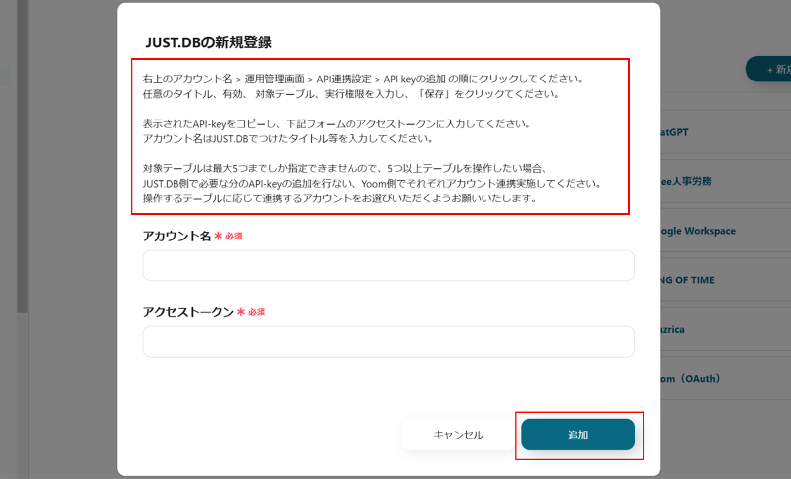 (5)「JUST.DBの新規登録」画面から、赤枠を確認の上、アカウント名、アクセストークンを入力し、「追加」をクリックします。