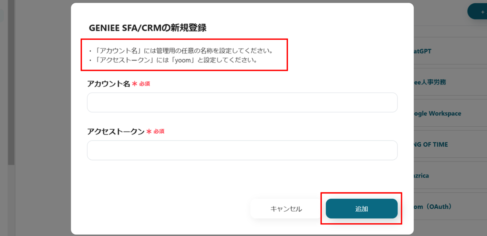 (3)「GENIEE SFA/CRMの新規登録」画面から、赤枠を確認の上、アカウント名、アクセストークンを入力し「追加」をクリックします。