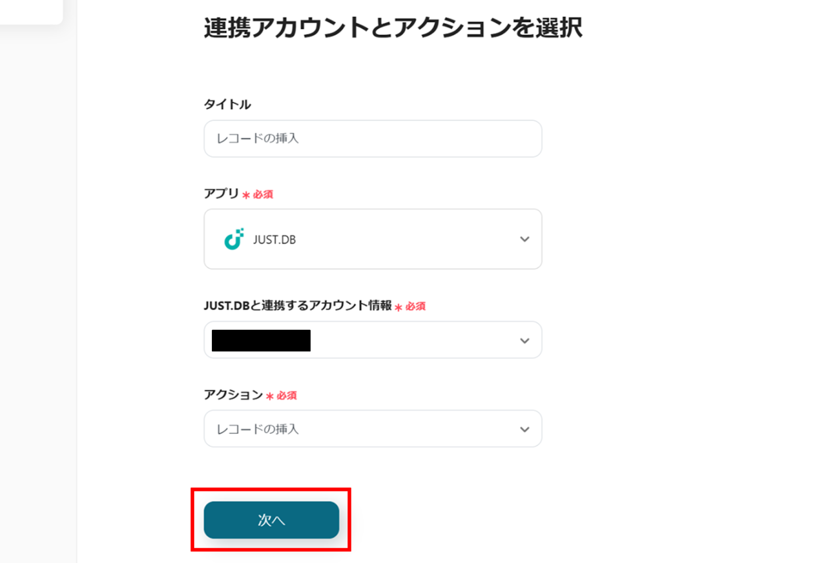 (2)JUST.DBの「連携アカウントとアクションを選択」画面から、JUST.DBと連携するアカウント情報に誤りがないかを確認し、アクションは「レコードを挿入」のままで「次へ」をクリックします。