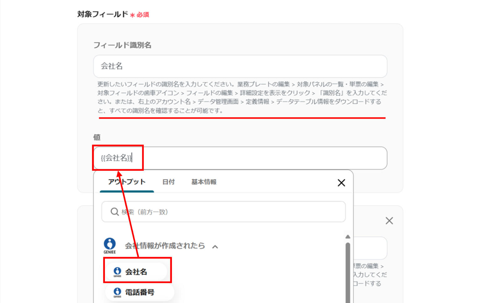 値はアウトプットから選択することで、GENIEE SFA/CRMの情報を引用することができます。