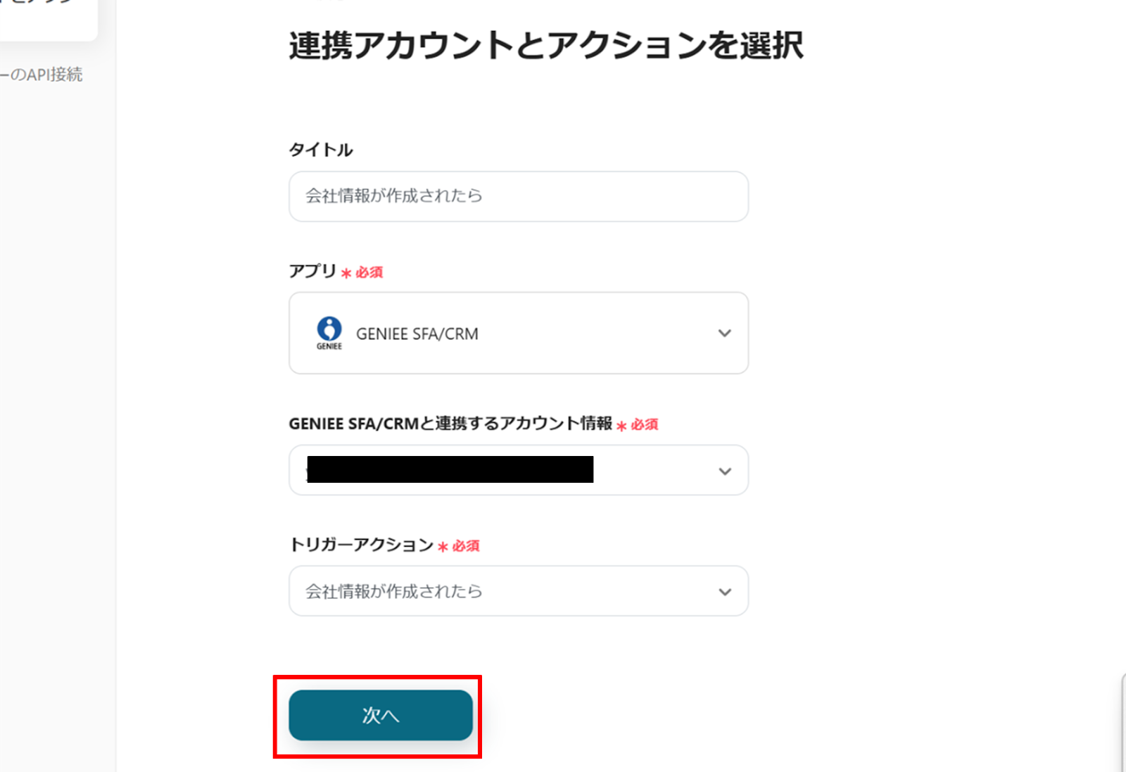(2)GENIEE SFA/CRMの「連携アカウントとアクションを選択」画面から、GENIEE SFA/CRMと連携するアカウント情報に誤りがないかを確認し、トリガーアクションは「会社情報が作成されたら」のままで「次へ」をクリックします。
